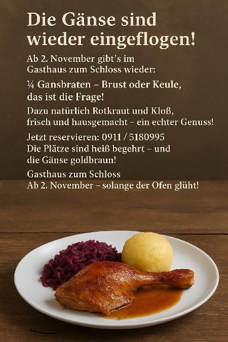 "Grüß Gott im Gasthaus zum Schloss" heißt es seit Generationen, wenn Gäste ankommen. Gastlichkeit ist bei uns mehr als ein Wort, sie ist eine Frage der Einstellung. In unserem traditionsreichen Gasthaus stehen schon immer gutbürgerliche, bayrisch-fränkische Gerichte mit frischen Produkten regionaler Erzeuger auf der Speisekarte - und das zu einem vernünftigen Preis. Ob ofenfrische Schäuferle, fangfrische Karpfen und argentinisches Rumpsteak oder einfach nur eine Brotzeit mit frisch gezapftem Bier - hier wird aufgetischt, was das Frankenland zu bieten hat.