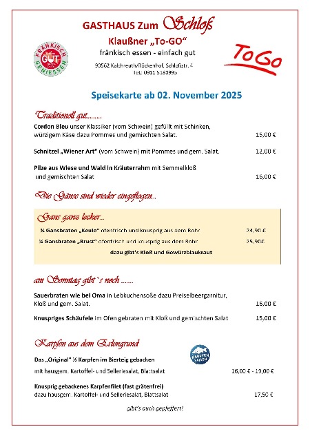 "Grüß Gott im Gasthaus zum Schloss" heißt es seit Generationen, wenn Gäste ankommen. Gastlichkeit ist bei uns mehr als ein Wort, sie ist eine Frage der Einstellung. In unserem traditionsreichen Gasthaus stehen schon immer gutbürgerliche, bayrisch-fränkische Gerichte mit frischen Produkten regionaler Erzeuger auf der Speisekarte - und das zu einem vernünftigen Preis. Ob ofenfrische Schäuferle, fangfrische Karpfen und argentinisches Rumpsteak oder einfach nur eine Brotzeit mit frisch gezapftem Bier - hier wird aufgetischt, was das Frankenland zu bieten hat.