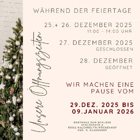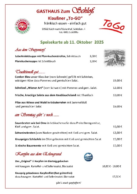 "Grüß Gott im Gasthaus zum Schloss" heißt es seit Generationen, wenn Gäste ankommen. Gastlichkeit ist bei uns mehr als ein Wort, sie ist eine Frage der Einstellung. In unserem traditionsreichen Gasthaus stehen schon immer gutbürgerliche, bayrisch-fränkische Gerichte mit frischen Produkten regionaler Erzeuger auf der Speisekarte - und das zu einem vernünftigen Preis. Ob ofenfrische Schäuferle, fangfrische Karpfen und argentinisches Rumpsteak oder einfach nur eine Brotzeit mit frisch gezapftem Bier - hier wird aufgetischt, was das Frankenland zu bieten hat.